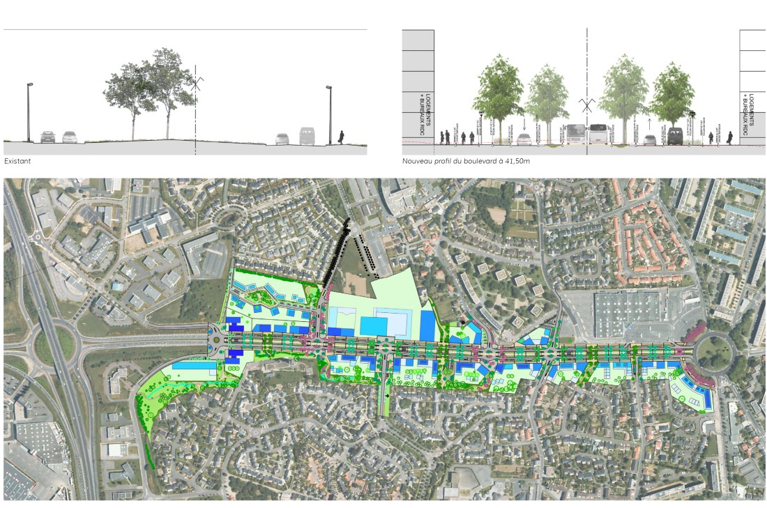 Il est pensé comme un morceau de ville animé, agréable à vivre et à circuler, de manière apaisée, retissant les liens entre les quartiers Sud et Nord. Deux fronts bâtis se développent de part et d’autre de l’espace public. Des commerces, services et bureaux animent les rez-de-chaussée des immeubles, laissant apparaitre dans les failles du bâti des espaces verts généreux constitués autour d’arbres préservés ou nouvellement plantés. Une succession de placettes actives (services, commerces, lieu de convivialité) séquence le Boulevard en relation avec les stations de la ligne de transport en commun en site propre.