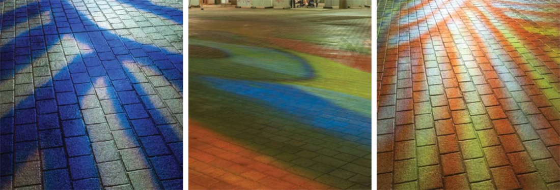 Le centre de la place est plongé dans une relative pénombre jusqu’à l’eau jaillissante et illuminée de la fontaine. Des œuvres d’artistes sont projetées sur le sol de la place.