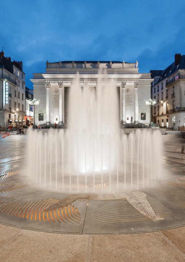 La symbolique culturelle résonnant avec le théâtre est développée par des signes exprimant la musique, le chant et la danse. L’élément central de la place est la fontaine qui apporte de la fraîcheur et de l’animation à l’espace minéral et son dallage de granit. La fontaine n’encombre pas l’espace car elle est matérialisée par des grilles en fonte posées sur le sol, aux motifs allégoriques de danseuses. Le sol est traité en granite beige clair en cohérence avec les autres aménagements du centre historique. Des candélabres décoratifs inspirés des lustres du théâtre sont répartis autour de la place. La place est ponctuée de végétaux placés dans des grandes vasques délimitant les contre-terrasses. L’éclairage public est étudié pour mettre en avant le théâtre, les balcons et les arcades des bâtiments et les contre-terrasses.