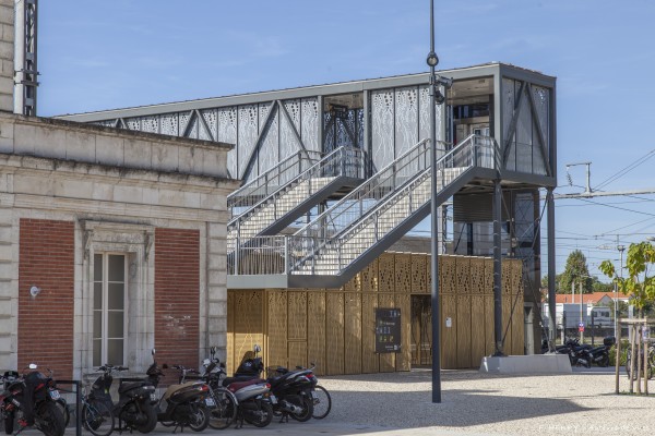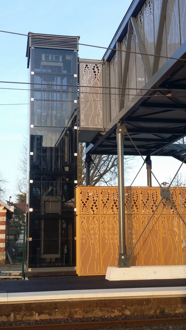 - Les parois verticales réalisées en tôle perforée aux motifs verticaux suggérant les vapeurs des cheminées des anciennes locomotives,