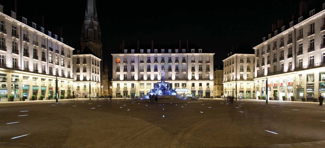 Des traits lumineux reprenant l’image d’eau projetée s’inscrivent dans le sol et rayonnent dans le pavage dans toutes les directions, de manière à renvoyer l’imaginaire des nantais au souvenir du rayonnement économique de leur cité grâce à la Loire et à son port.
