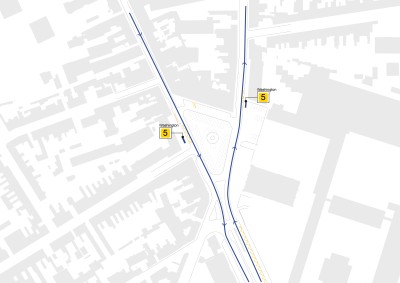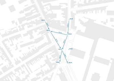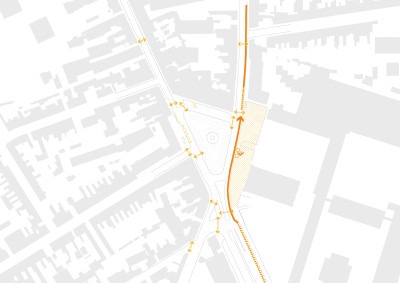 Le traitement s’étendra de façade a façade. Deux massifs et un habillage, en acier corten seront mis en œuvre pour marquer et symboliser l’ancienne porte, mettant en scène la traversée piétonne.