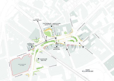 Ainsi, dans la composition de la place, le traitement de l’effet de Porte et de mise en relation de la cité avec la ville hors les murs, est réalisé par l’aménagement d’une large «traversée - esplanade» entre la rue de la vieille porte et le tissu urbain des maisons à pan de bois.