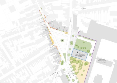 L’enjeu majeur de l’aménagement place G.Washington est de retrouver un caractère de place et un espace de proximité sur ce site. Convergence de plusieurs flux, le projet doit aussi intégrer l’intermodalité tout en composant un espace public de qualité, réintroduisant la trame verte au coeur du projet d’aménagement pour un espace public capable et multi-usages.