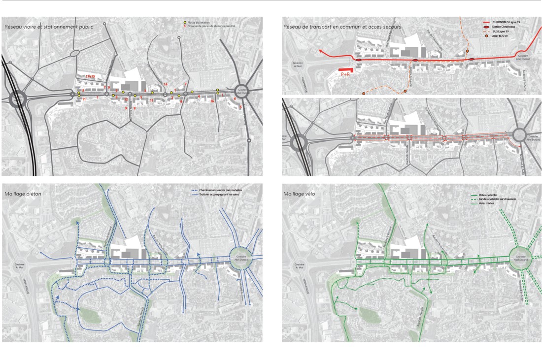 Ce nouveau boulevard paysager s’inscrit dans un réseau structurant d’espaces libres naturels connectés au grand territoire et de cheminements pour les piétons et les vélos. La préservation des franges végétales et arborées sur l’espace public et leur infiltration au cœur des îlots privés, a contribué à l’acceptation du projet et de sa densité (R+5) par les riverains au cours d’un processus de concertation publique établi à la fois à l’échelle globale ainsi qu’à celle de chaque îlot.