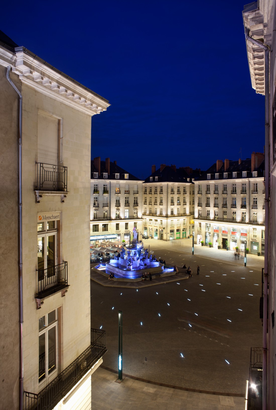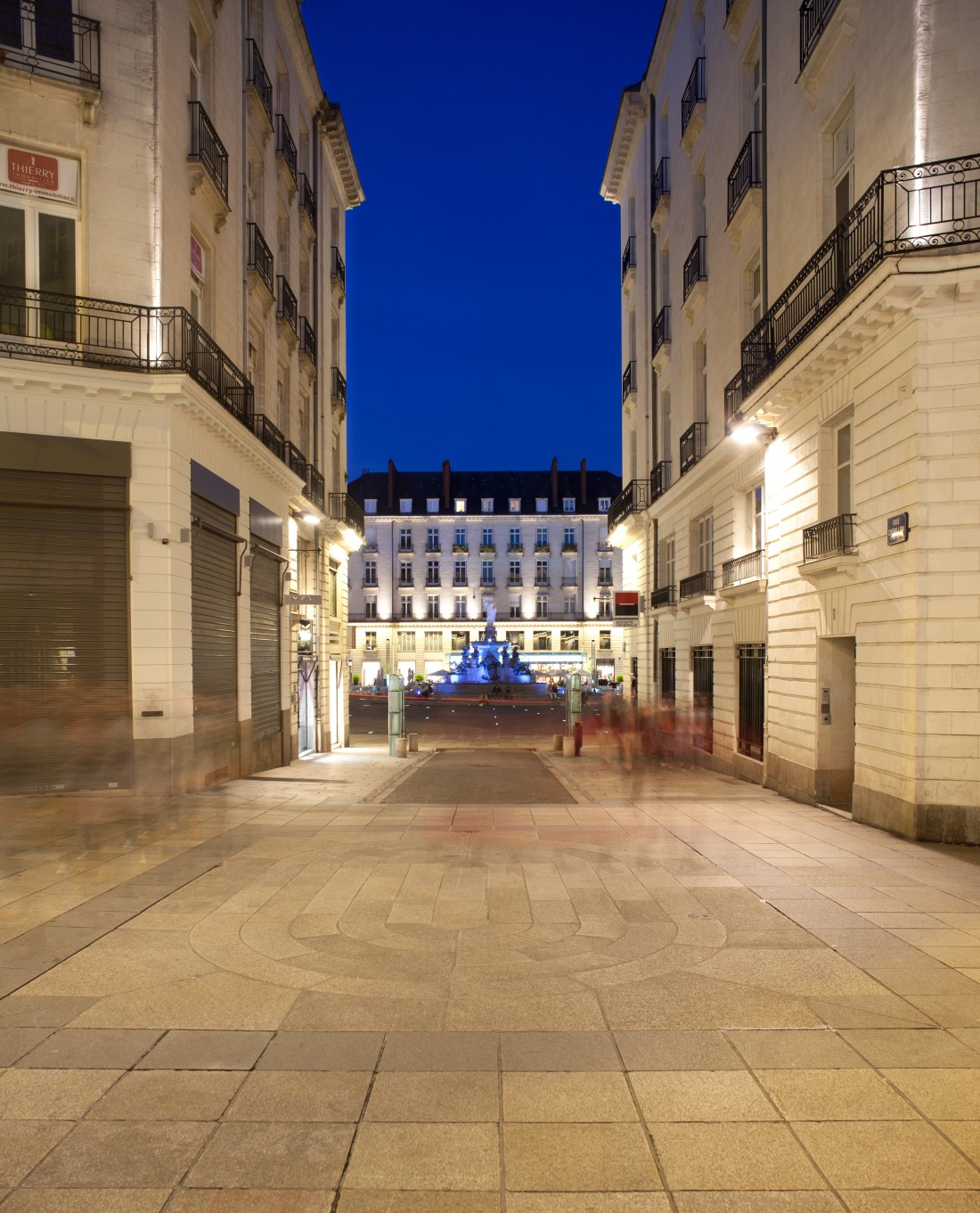 Des traits lumineux reprenant l’image d’eau projetée s’inscrivent dans le sol et rayonnent dans le pavage dans toutes les directions, de manière à renvoyer l’imaginaire des nantais au souvenir du rayonnement économique de leur cité grâce à la Loire et à son port.