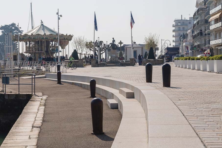 Le parti d’aménagement consiste à préserver le caractère portuaire du quai Jules Sandeau en s’inspirant de la simplicité des aménagements qui existaient au début du XXe siècle. Ceux-ci offraient une lecture claire d’un grand plan incliné vers le perré en granite accompagnant la courbe de l’étier. Les aménagements imaginés aujourd’hui tendent à concevoir un espace apaisé, dévolu principalement à la déambulation, permettant une activité portuaire (pêche ou plaisance) et confortable où l’on pourra, suivant la saison et l’heure de la journée profiter, debout ou assis, de la vue sur le port, sur les terrasses, au bord de l’étier ou à l’ombre des édifices bordant le quai.