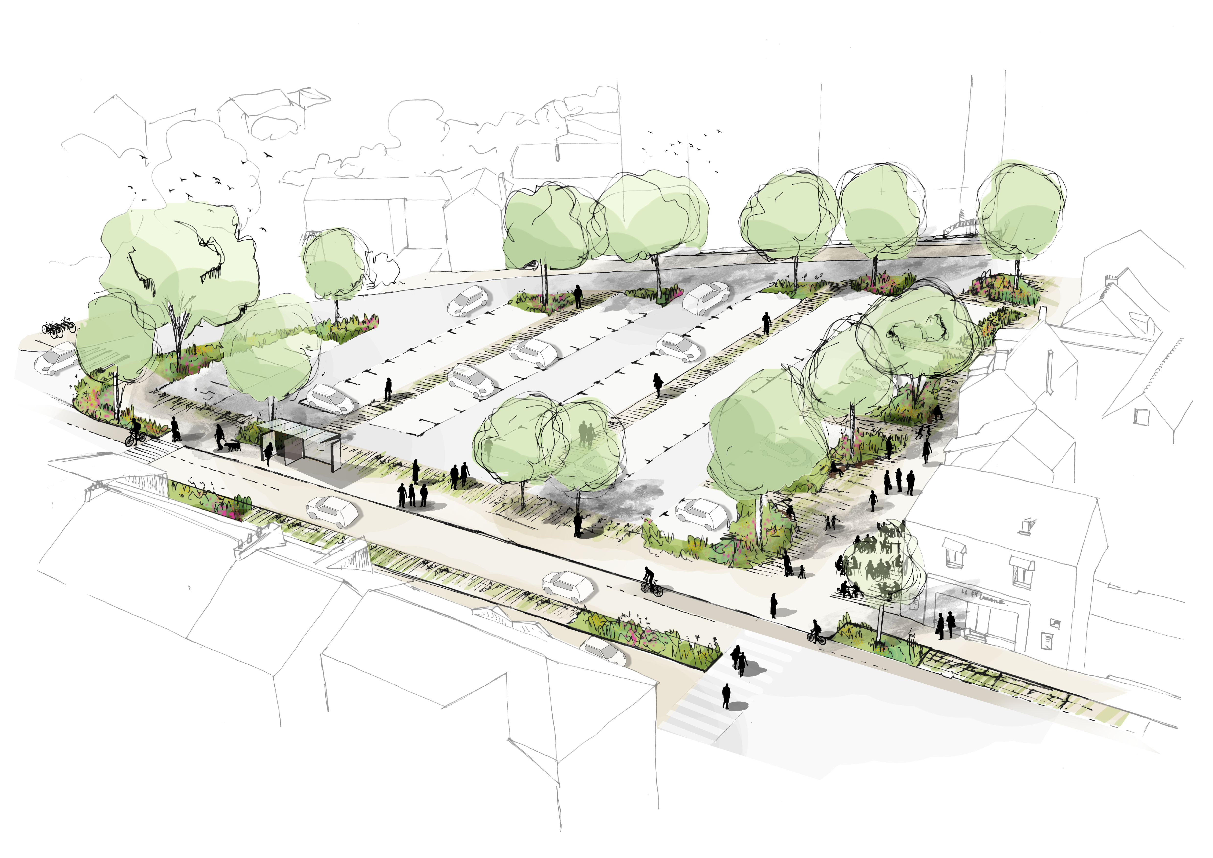 La composition de la place s’organise suivant axe Nord/Sud offrant des traversées visuelles et piétonnes, tout en intégrant le stationnement et reliant la place à l’Avenue de la Libération : une couture entre l’habitat, le stationnement et l’espace public. La place du Pâtis Saint Lazare retrouve dans son aménagement des porosités dans le traitement, des perméabilités de sols et des porosités visuelles. La place n’est plus seulement un lieu de stationnement, elle devient, par la création d’une bande active le long des façades d’habitations, un véritable lieu à vivre au quotidien. A l’écart du stationnement, séparée par un large massif planté, cette nouvelle bande piétonne permet de déployer de nouvelles activités de proximité tel qu’un espace libre récréatif, l’extension de la terrasse de café, une aire de repos avec du mobilier urbain adapté, un lieu accueillant et chaleureux. Cette bande active permet de redonner au site un caractère de place de quartier, de proximité, dans un esprit « village », un lieu de rencontre et de convivialité. Les ambiances végétales tout autour de la place laissent le regard libre sur l’horizon cadré par de nouvelles plantations d’arbres et densément plantée, avec un jeu d’arbustes, vivaces et graminées offrant ainsi une ambiance dynamique.