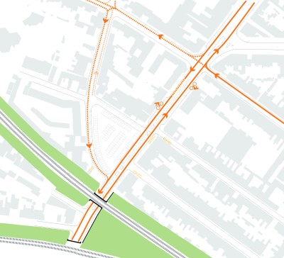 Le traitement s’étendra de façade a façade. Deux massifs et un habillage, en acier corten seront mis en œuvre pour marquer et symboliser l’ancienne porte, mettant en scène la traversée piétonne.